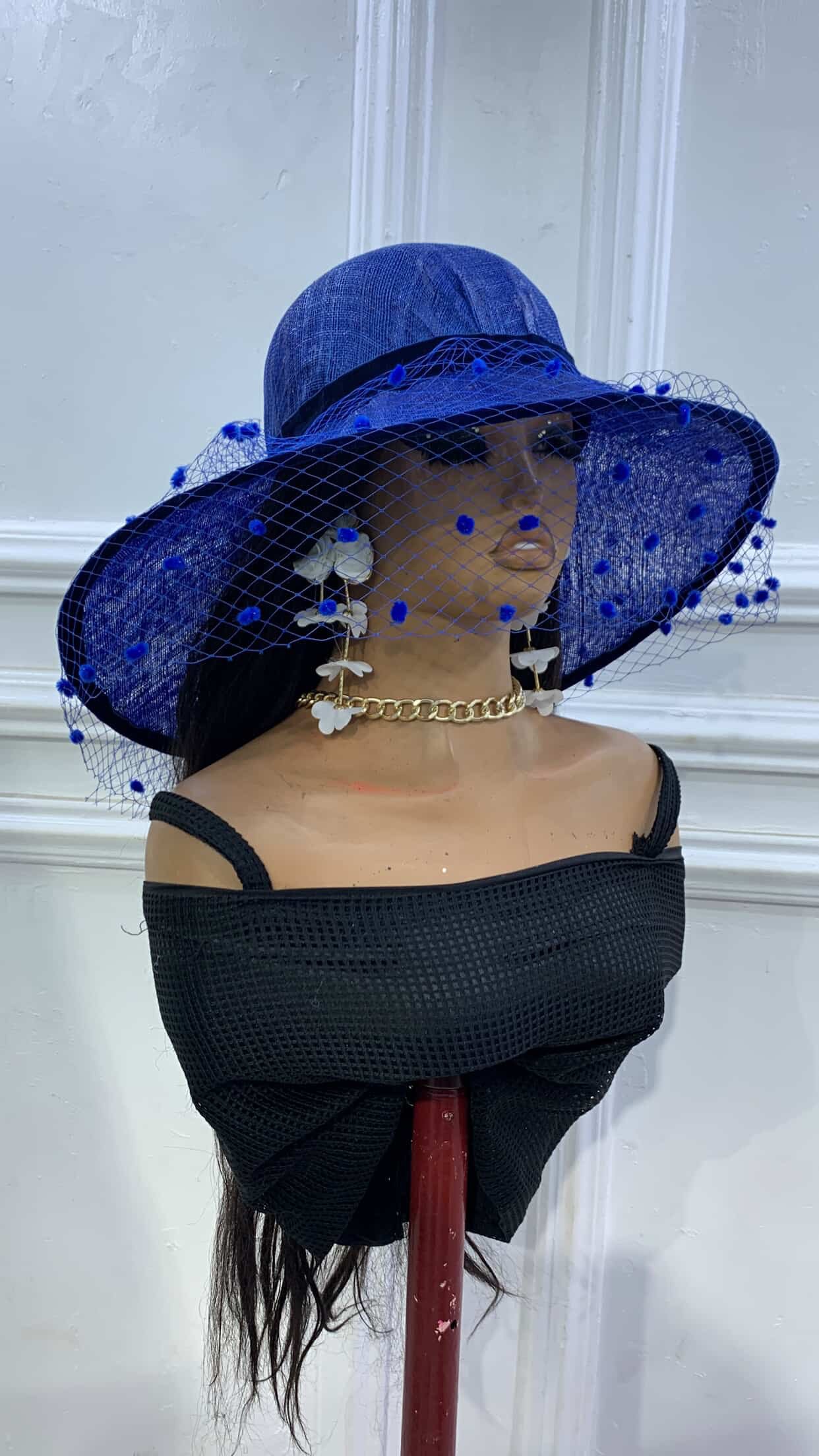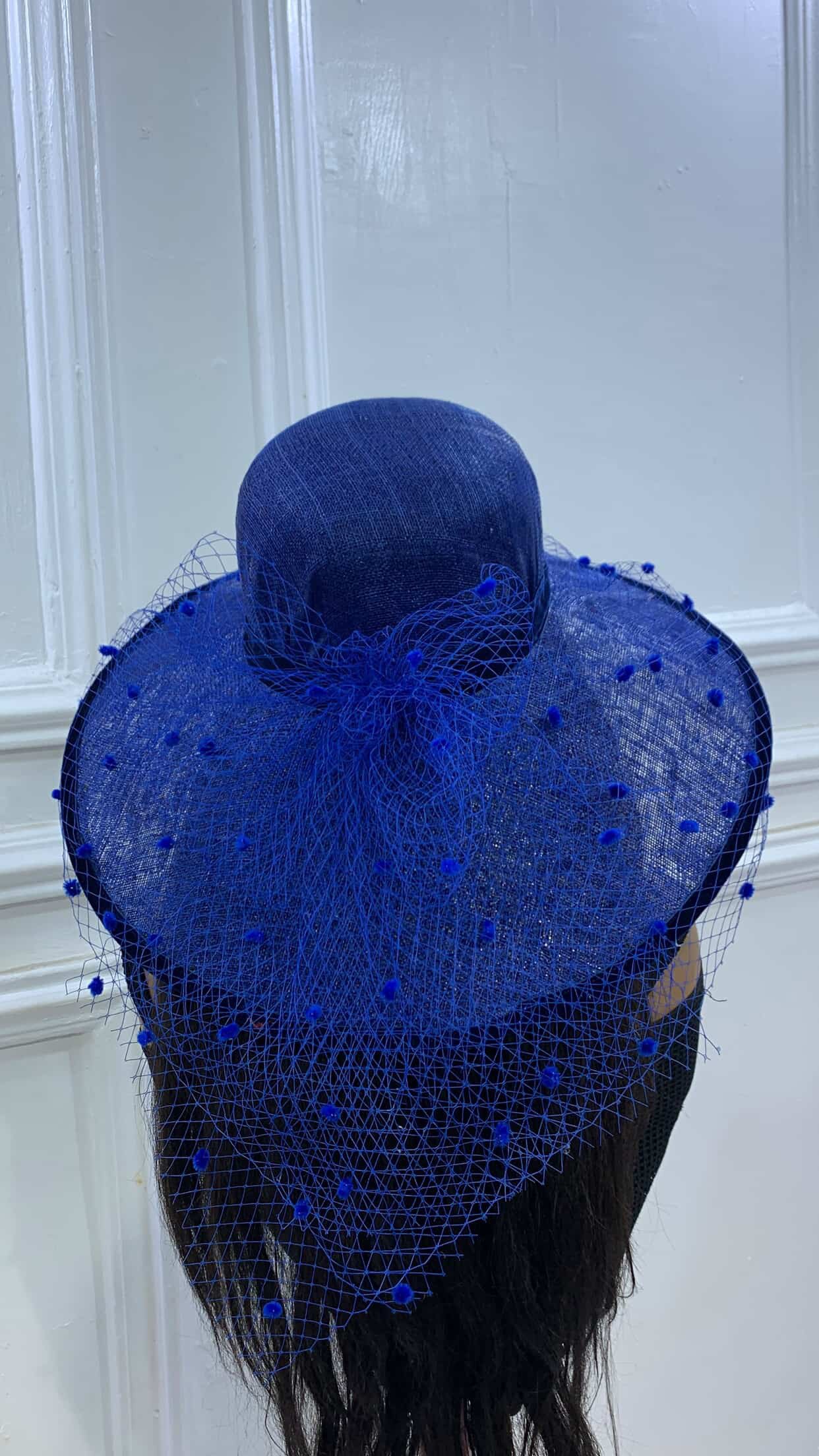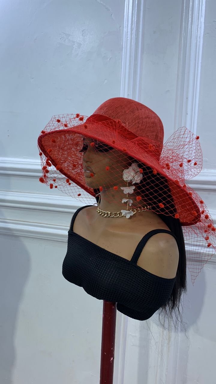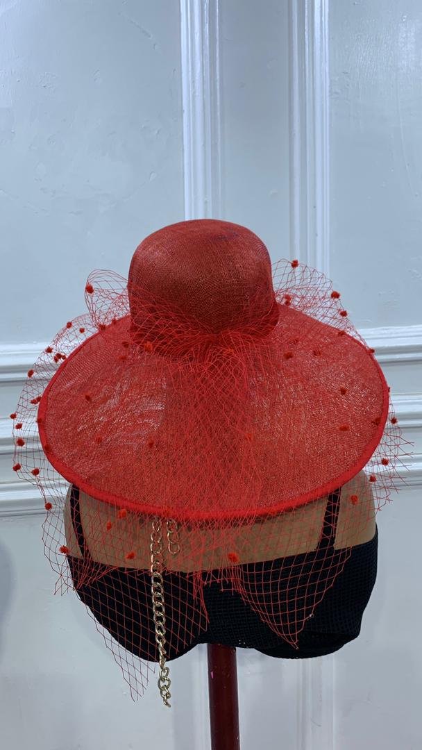 made with Sinamay in cone shaped brim with veiling and dots for that classy richness