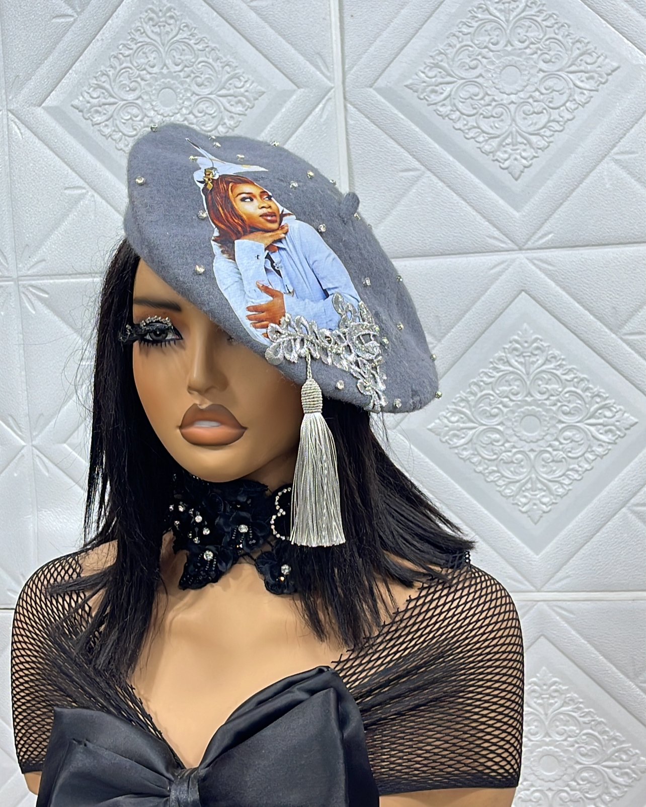 Aidentity beret, personalized beret with custom face print with embellishments and tarsel for that announcement
