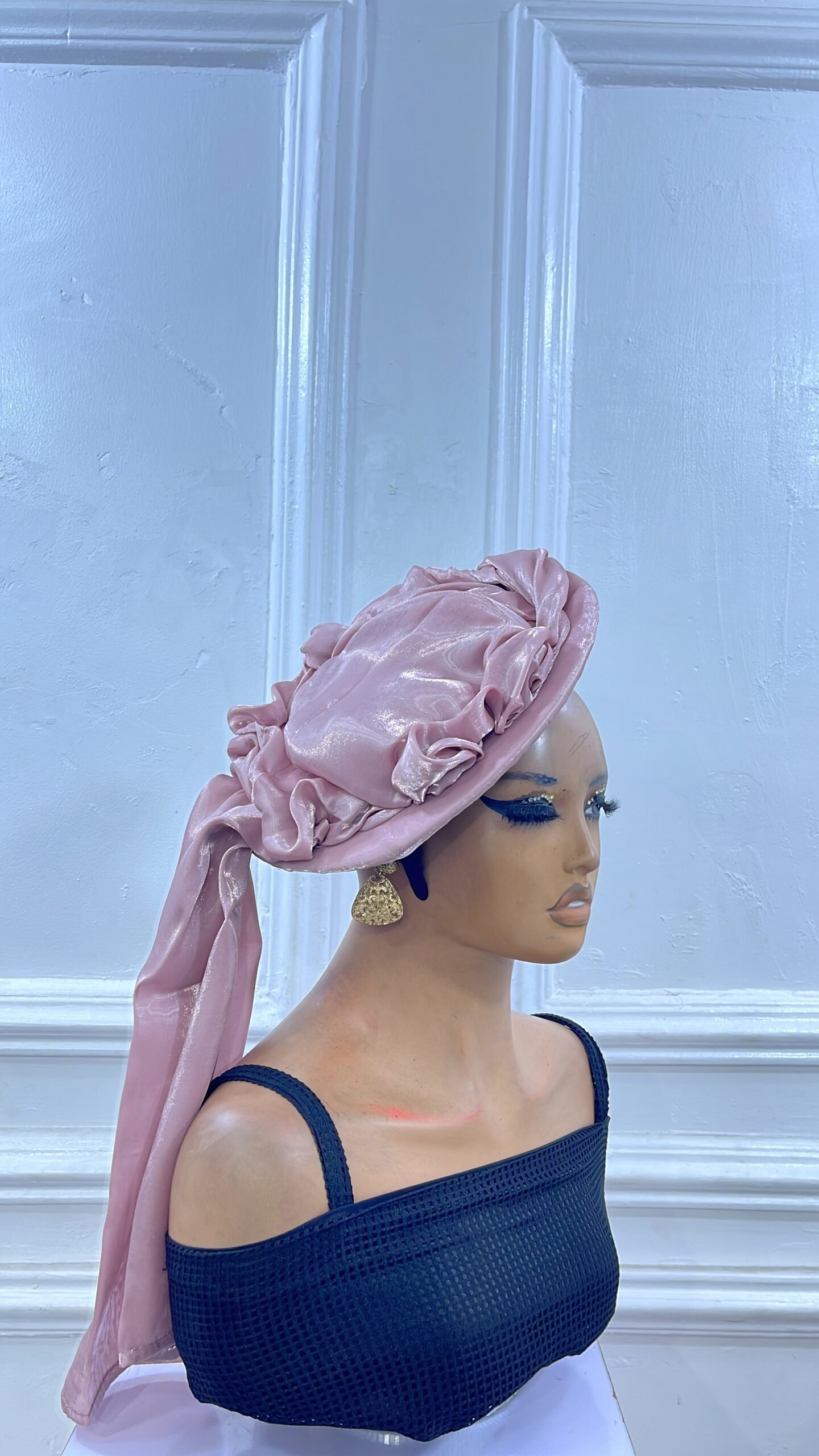 small-sized crown and brim rich mercury hat with ruffled band extending as back scarf for that extra flair and glam