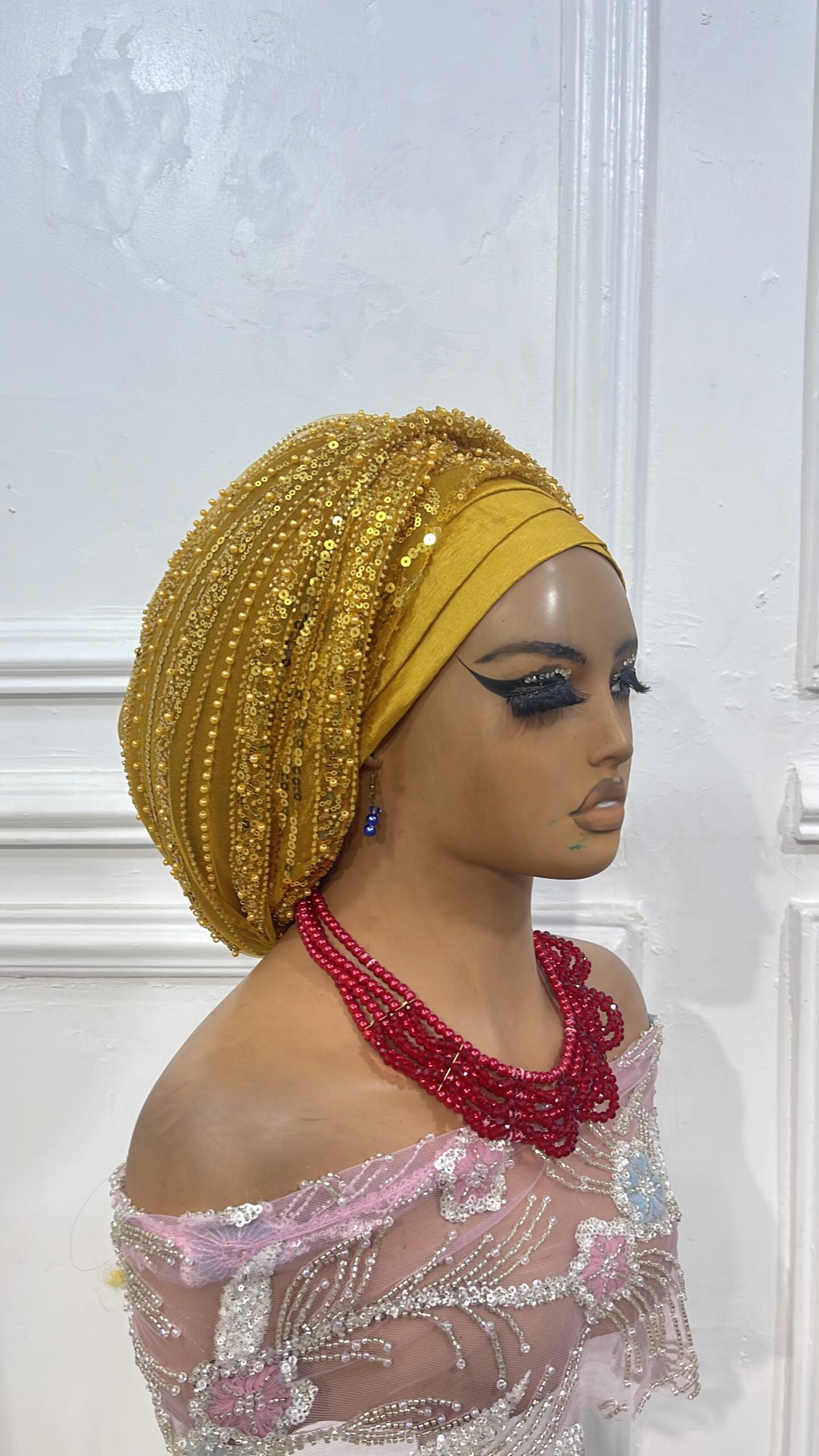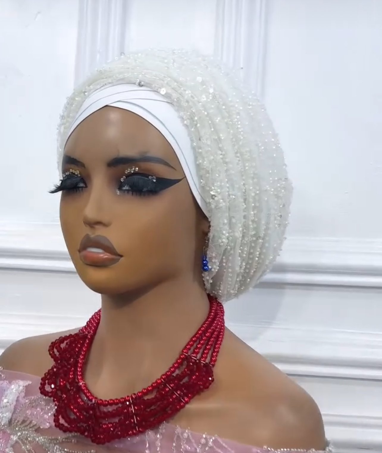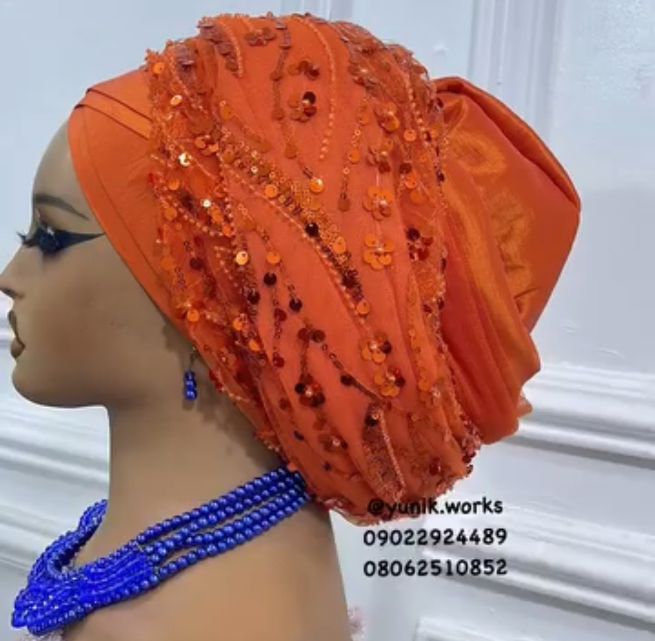 a Dupion silk and net wrap turban made with rich beaded lace and tulle long hands for that regal look