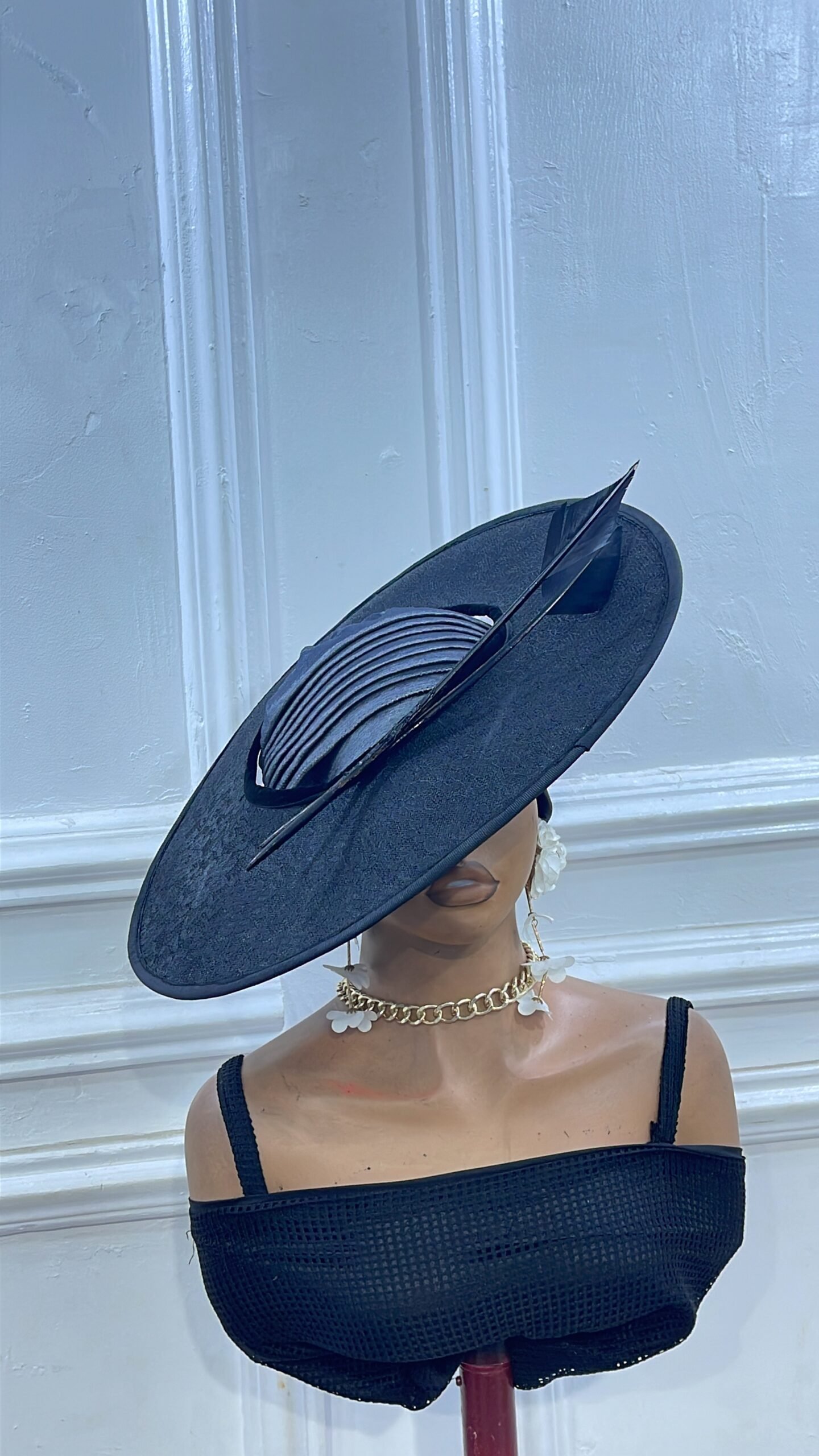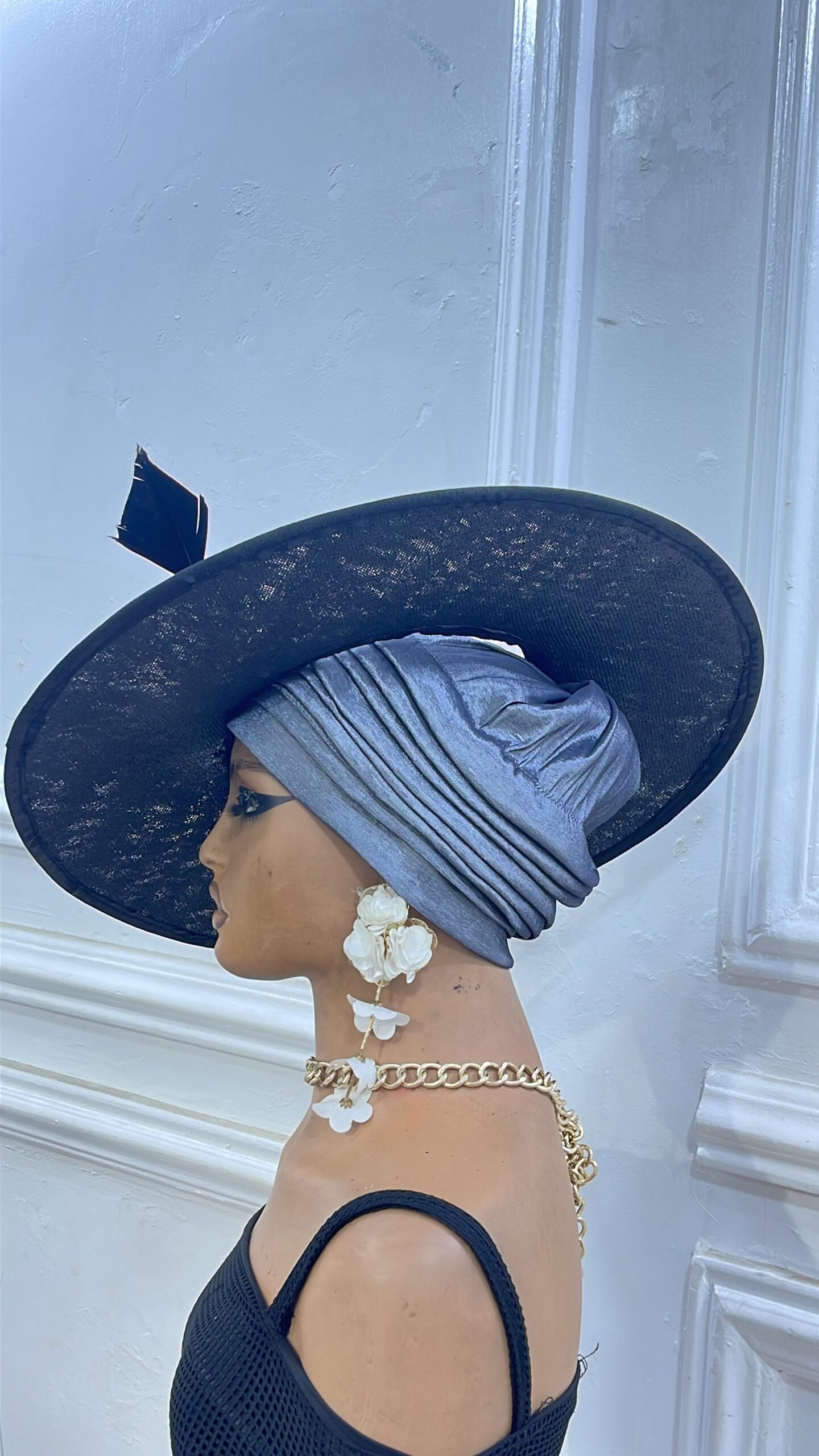 2 in 1 detachable crownless brim with feathers with underneath pleated turban for that classy richness