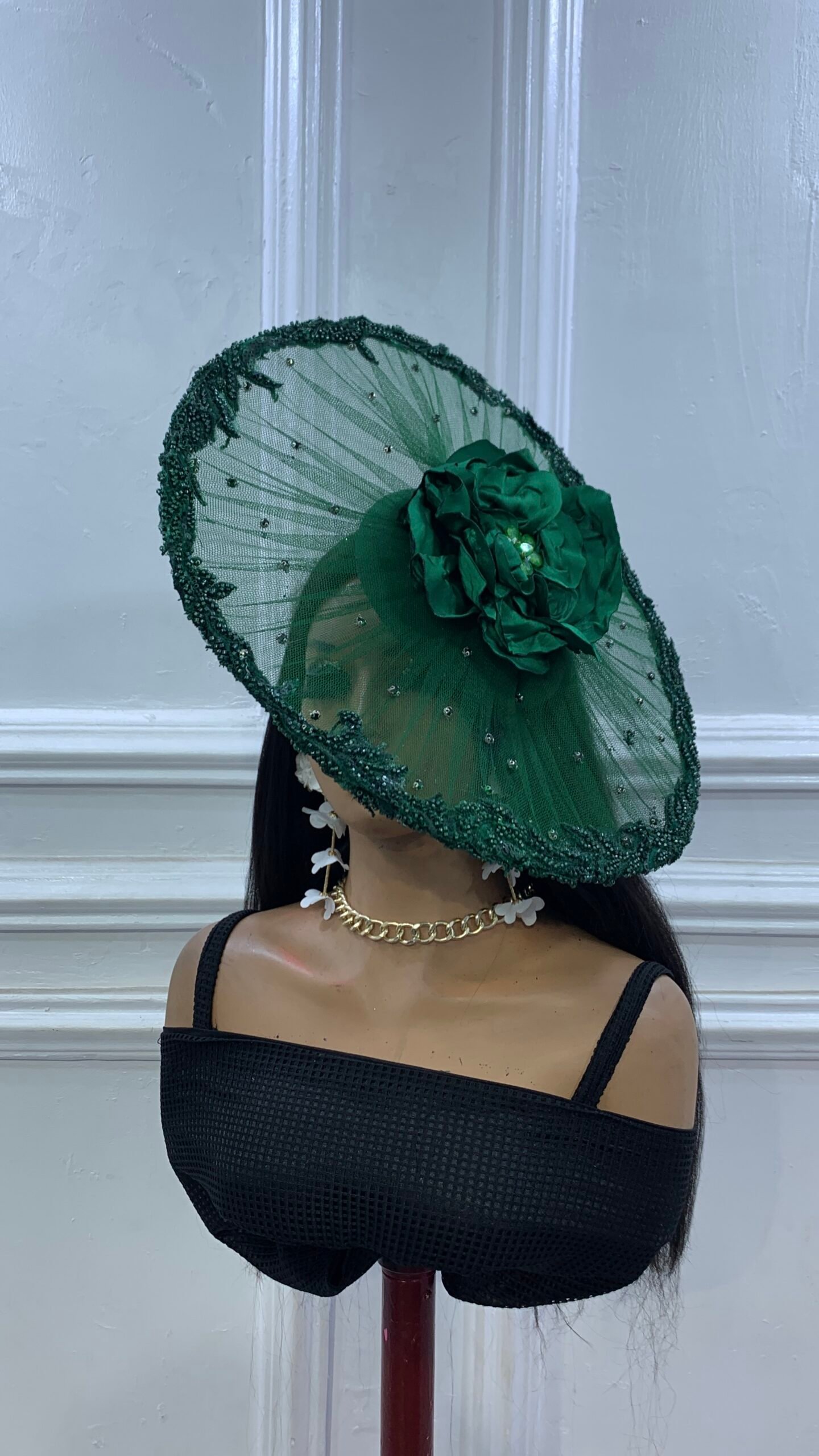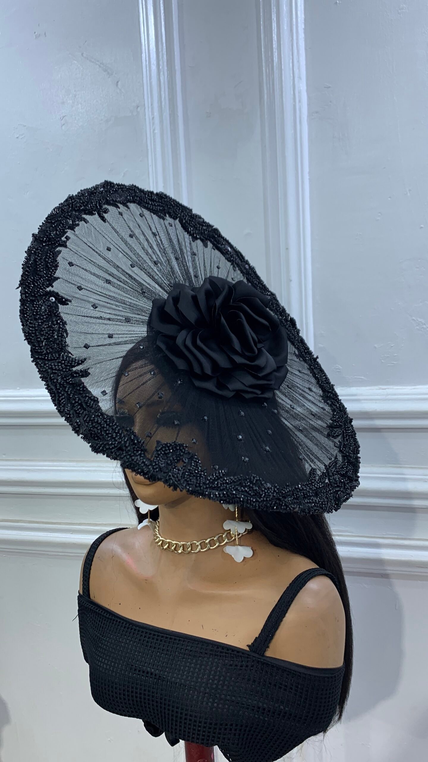 gorgeous circler mesh pleats headpiece with crystal stone details and centre lush rose with edges carefully layered with beaded structure detailing all round for that unique look