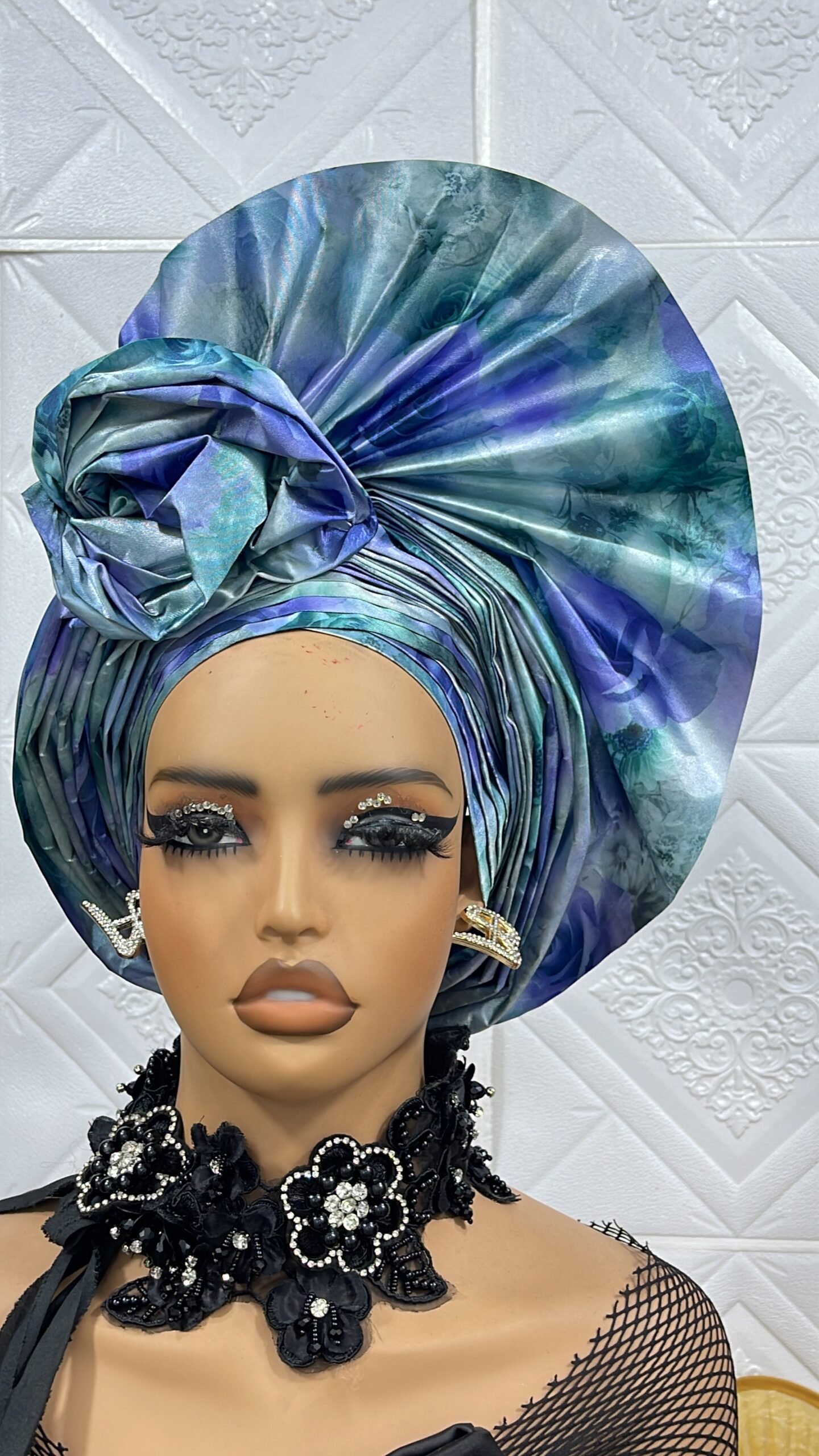 Comes with shoulder Ipele, Made with embossed 3D Segoe featuring pleats, fans and ruffled rose for that elegance