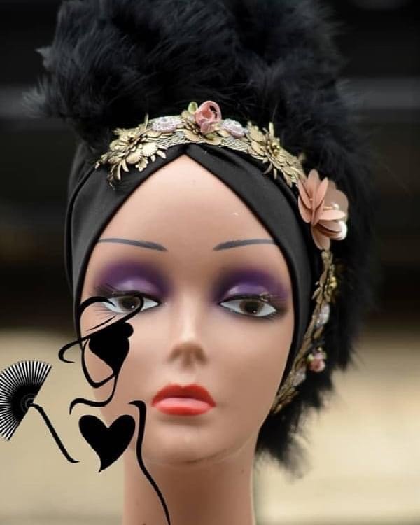 classy turban with side full feather detailing embellished with rose statement trims for all the extra glam