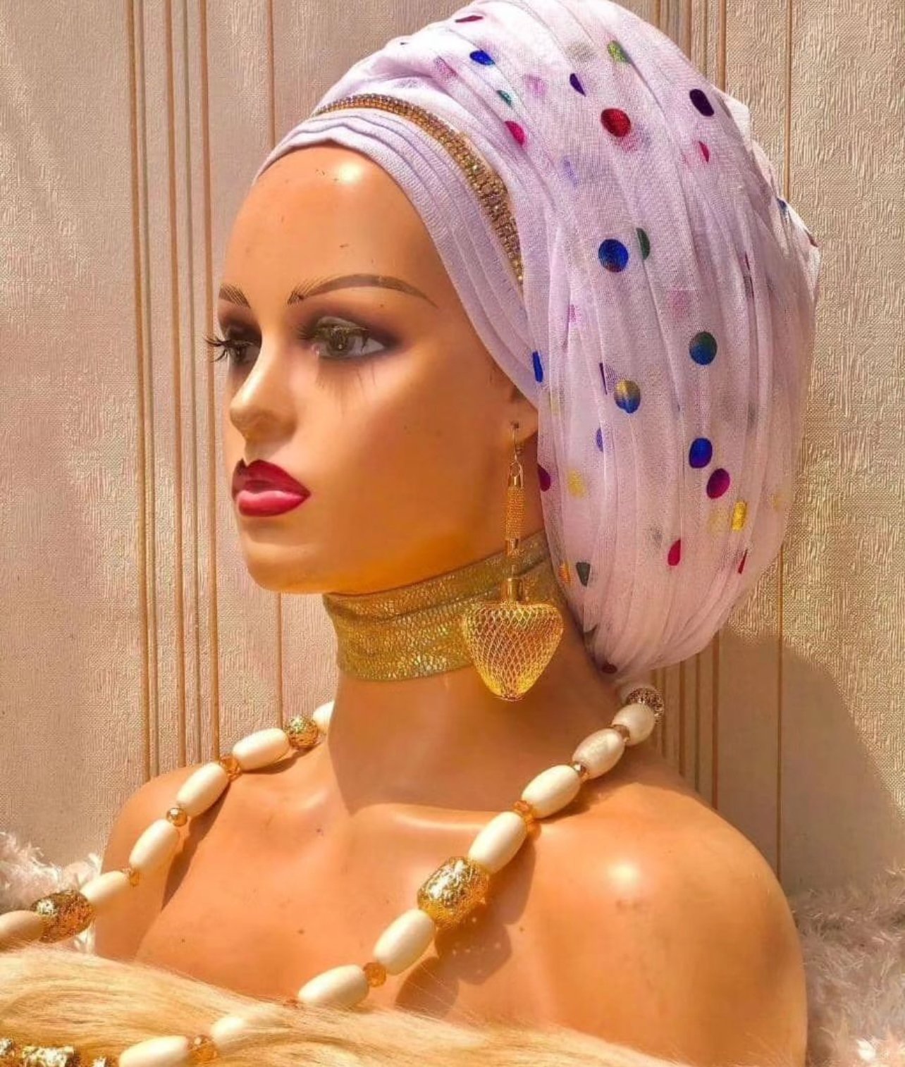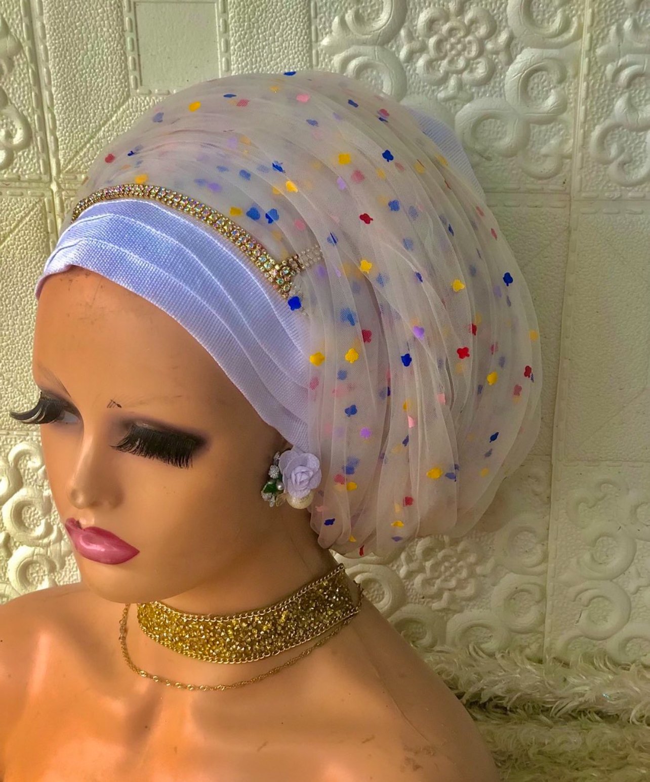 Super full double hand polkadot tulle wrap sitting on asooke cap with stud trim embellishment in front to separate the face from the wrap and give that exquisite look and would be wrapped t