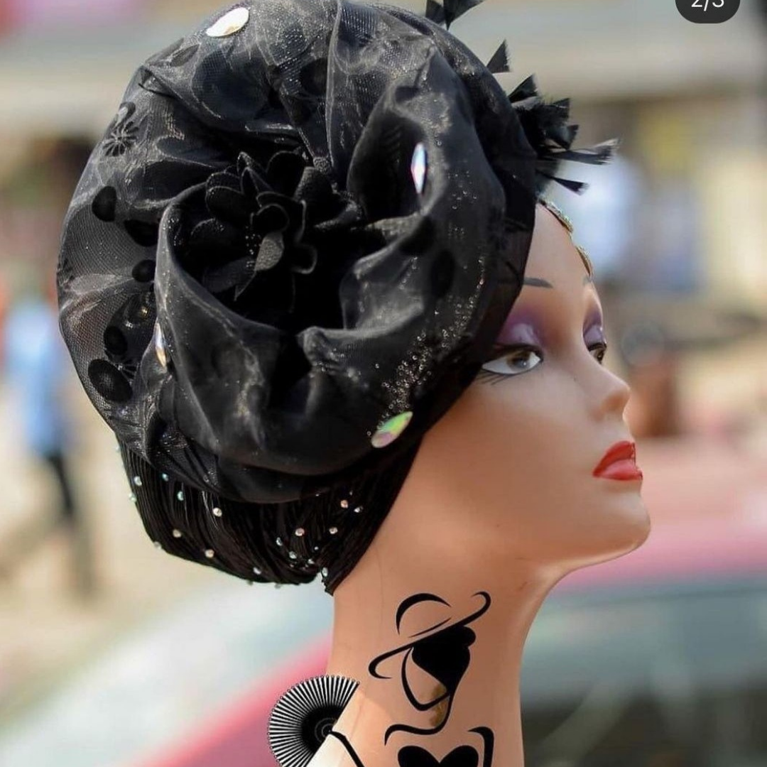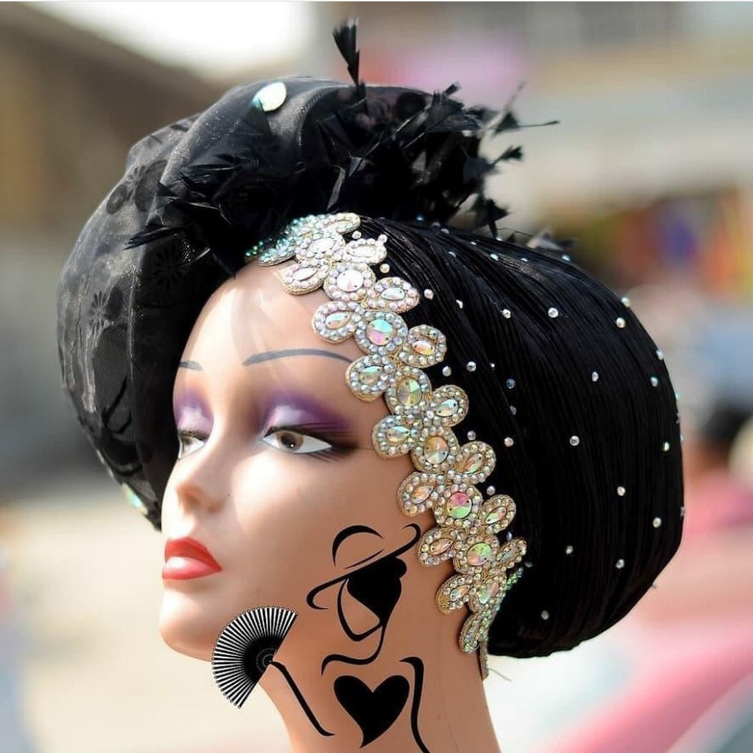a collection of many gorgeous features on a lush Sunray crystal bedazzled turban for that rosey glam look