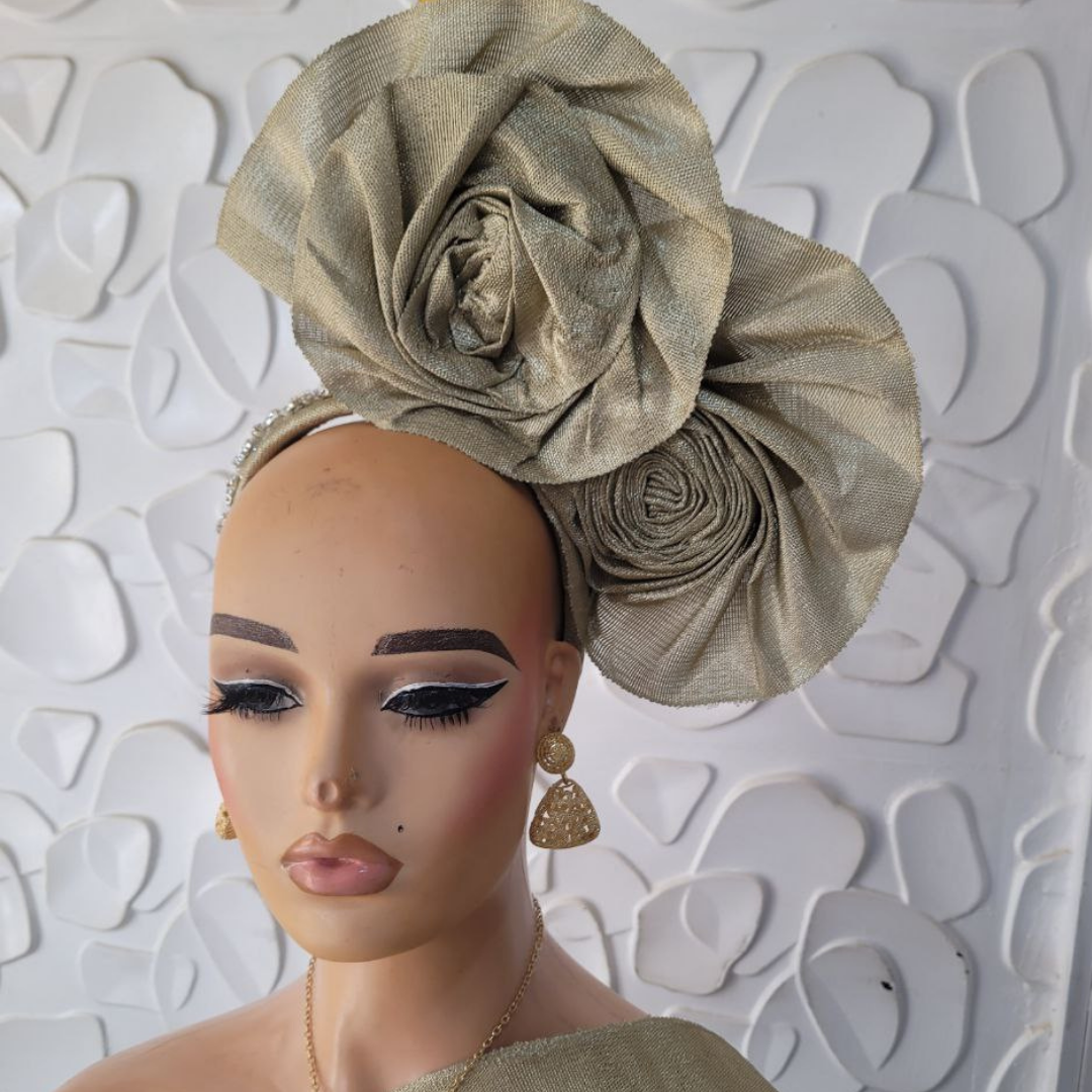 made with lush metallic asooke featuring double top rose standing on Alice band with crystal stud embellishments on band
