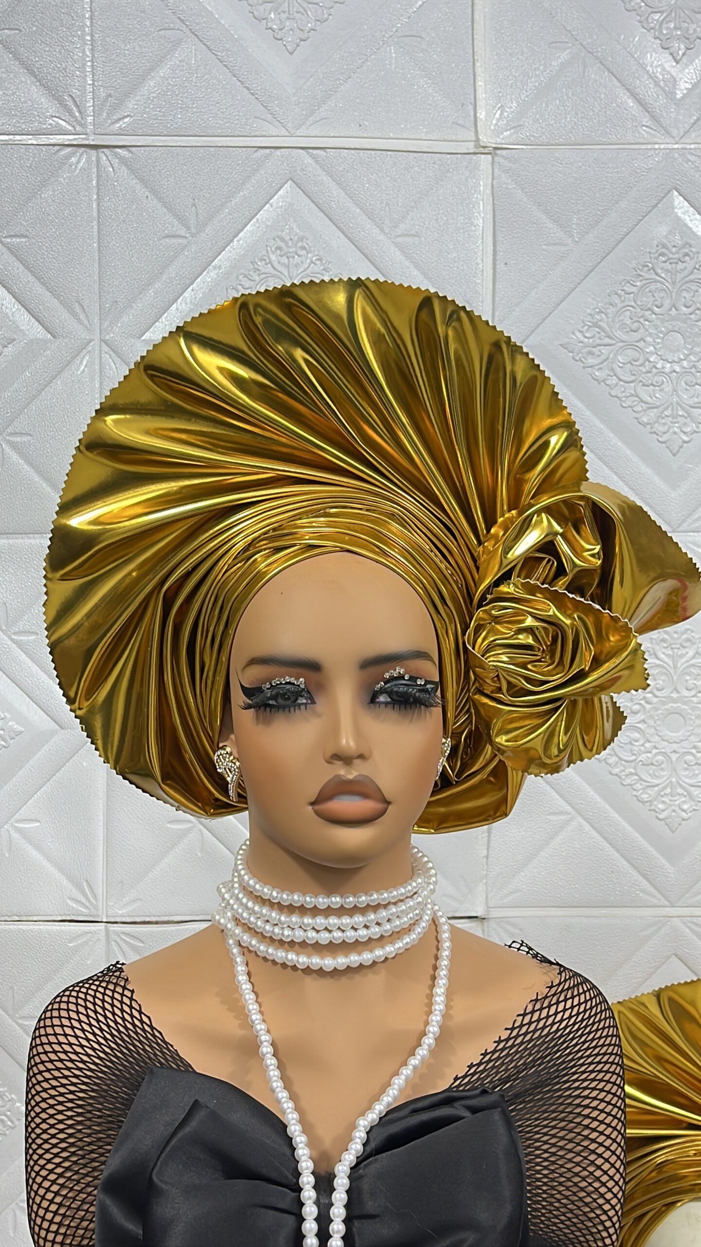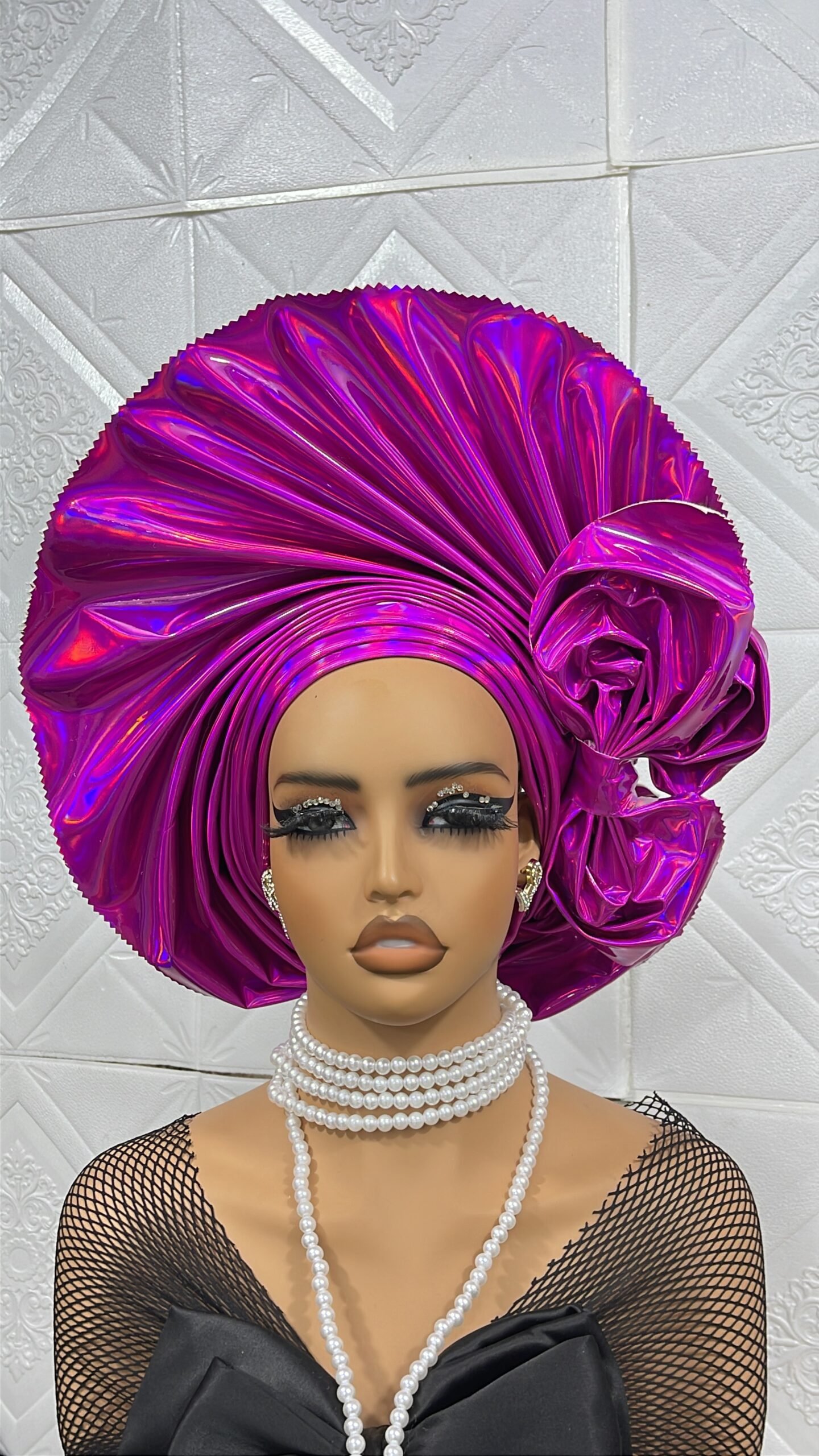 Made with lush metallic leather featuring rounded fans with side bows in rose extensions for that fullness and elegance