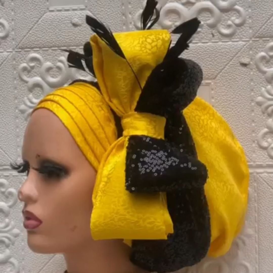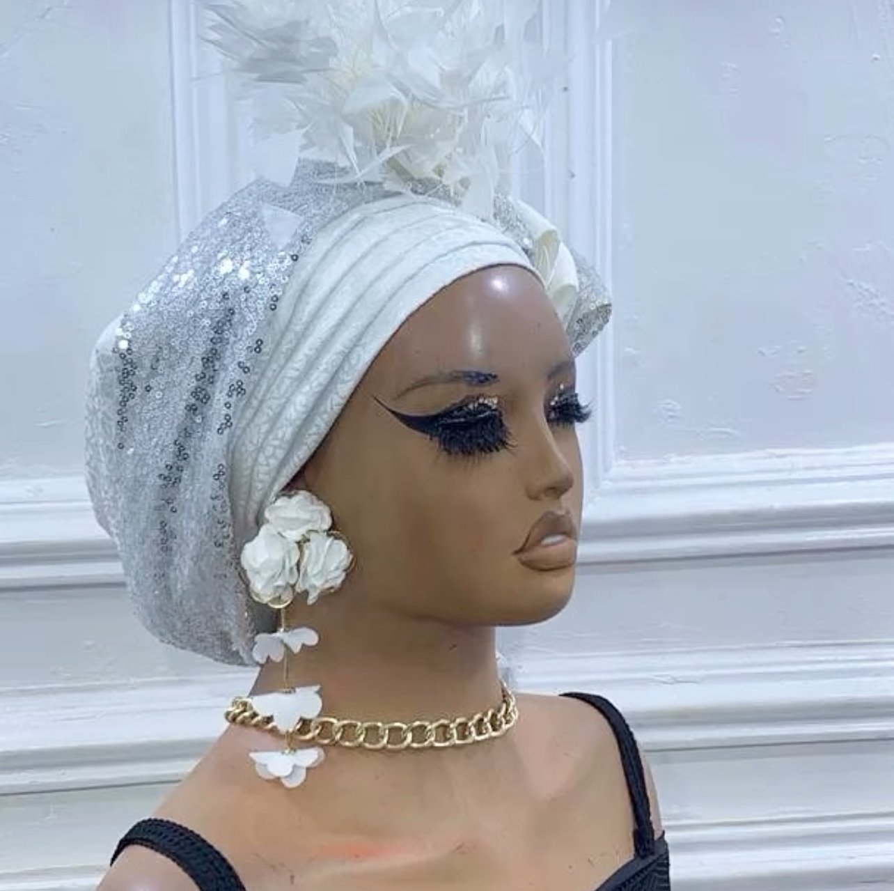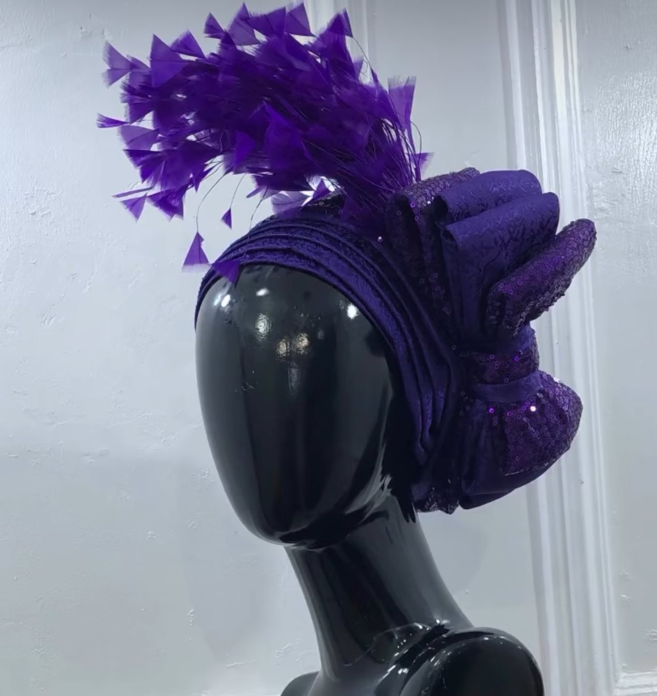pleated in embossed damask flap cap with side bow details embellished with sequin detailing and feathers for that extra glam